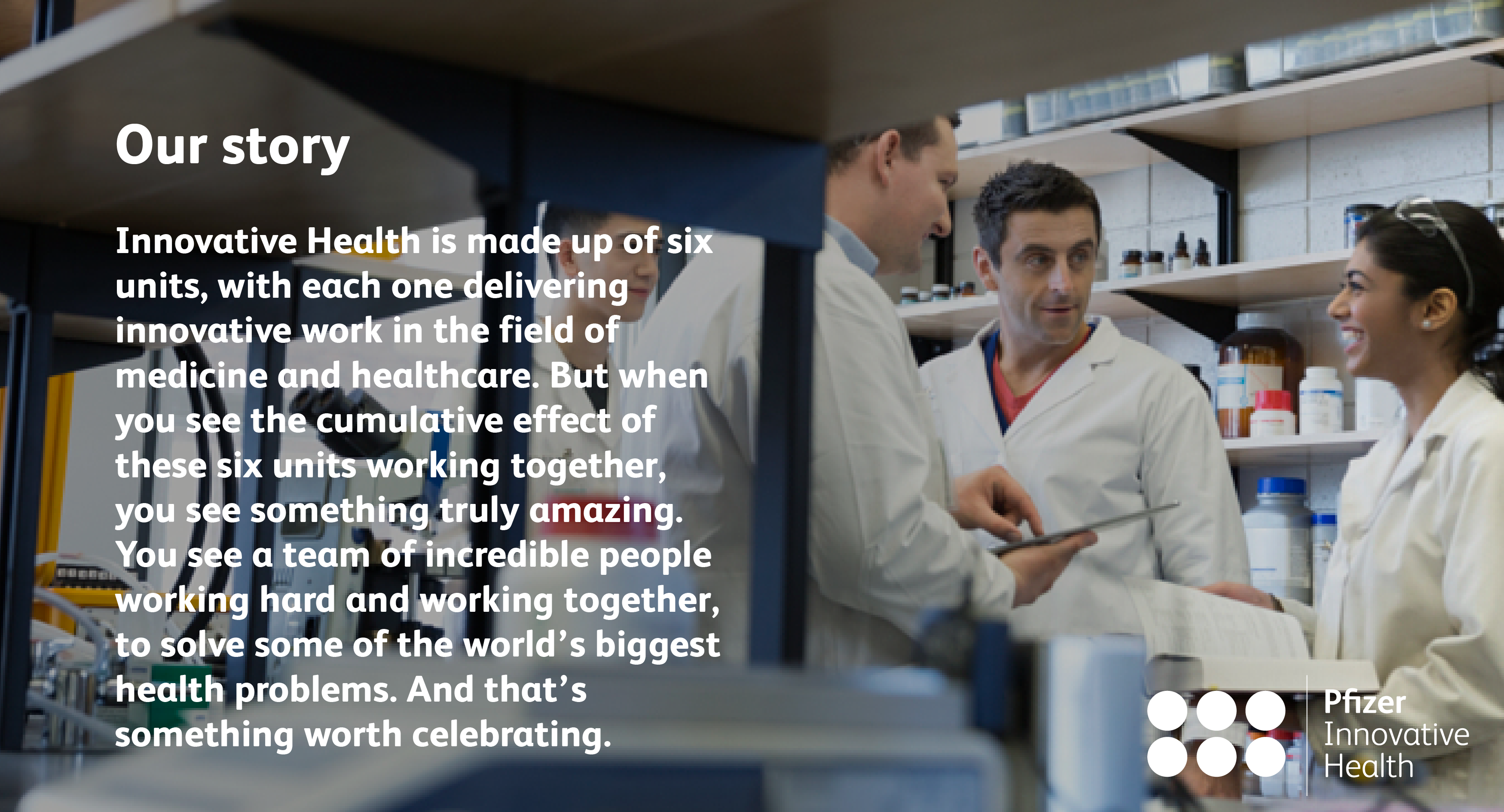 The Challenge was to make them feel part of the same company while being clearly differentiated from the rest. Pfizer’s general branding is based on circles, so I created a logo using circles that would work as separated entities that combined to form a whole.