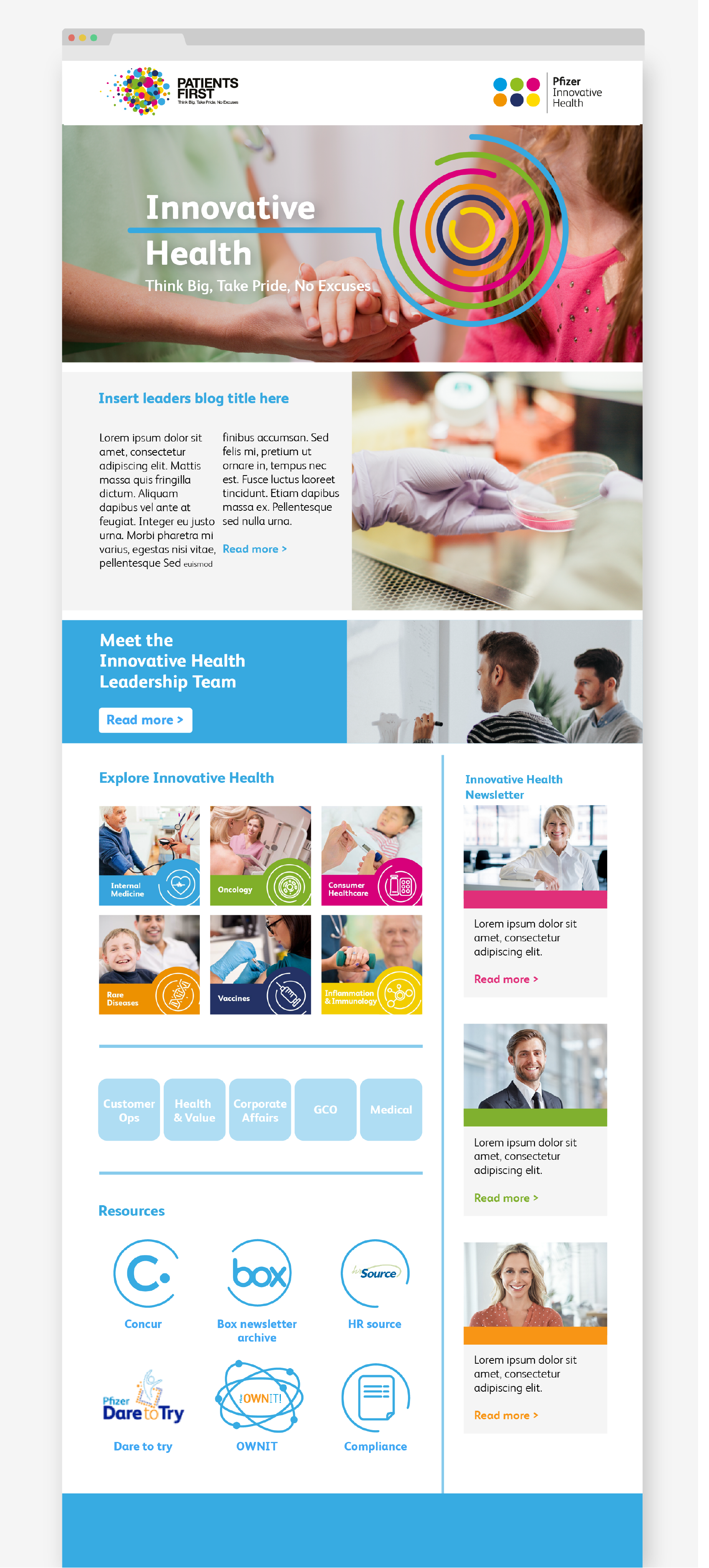 Pfizer needed to simplify its intranet and unify each of its six departments. Having never been designed before, it consisted of a ‘combination’ of different brand styles mainly coming from pharmaceutical products.