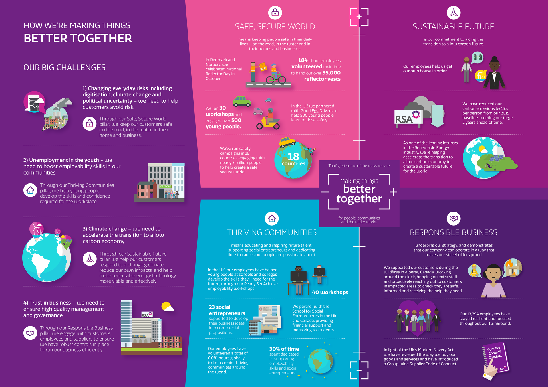 RSA is an international insurance company who wants to be a responsible business. We helped them by developing their Corporate Responsibility strategy called 'Making Things Better Together'. Using an illustrative approach, I created an infographic that explains their strategy in detail.